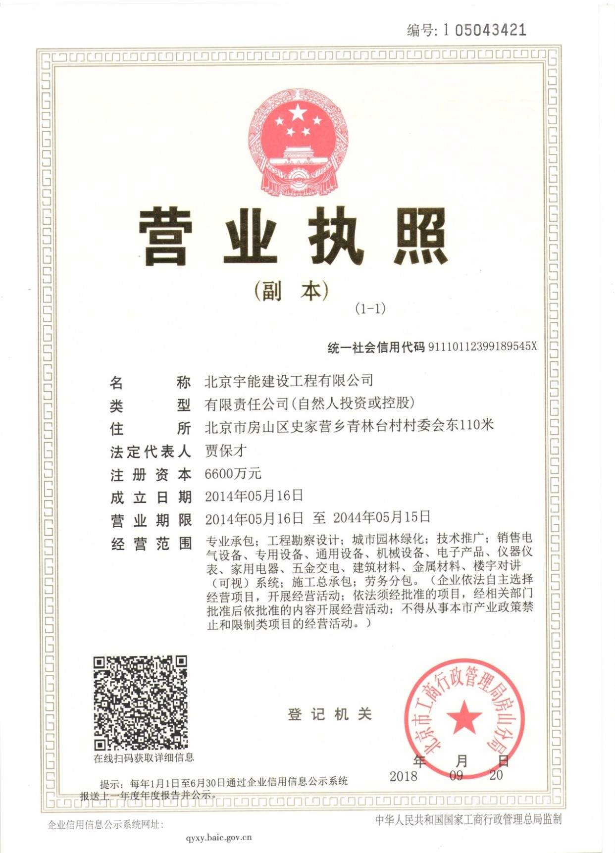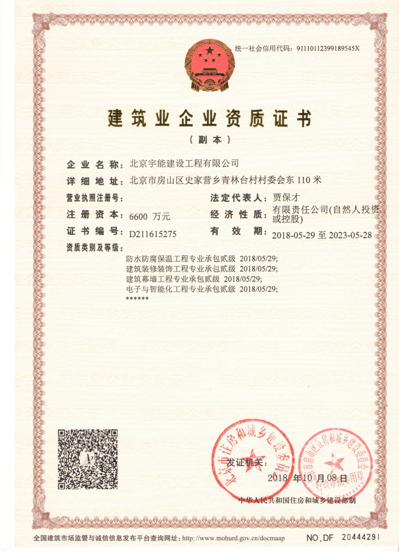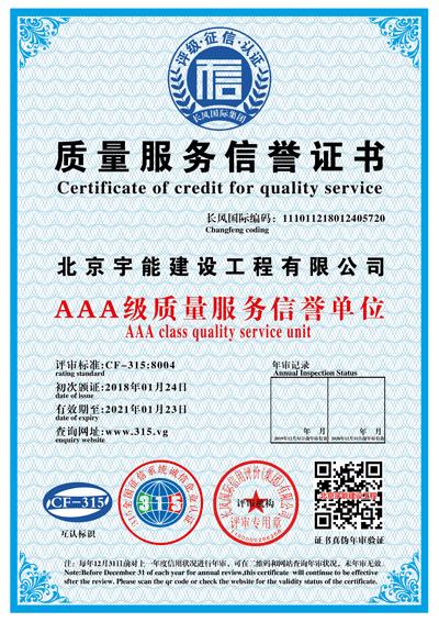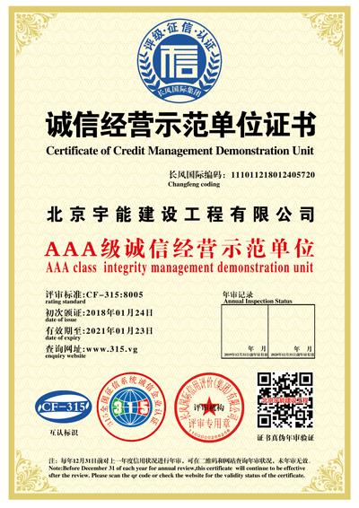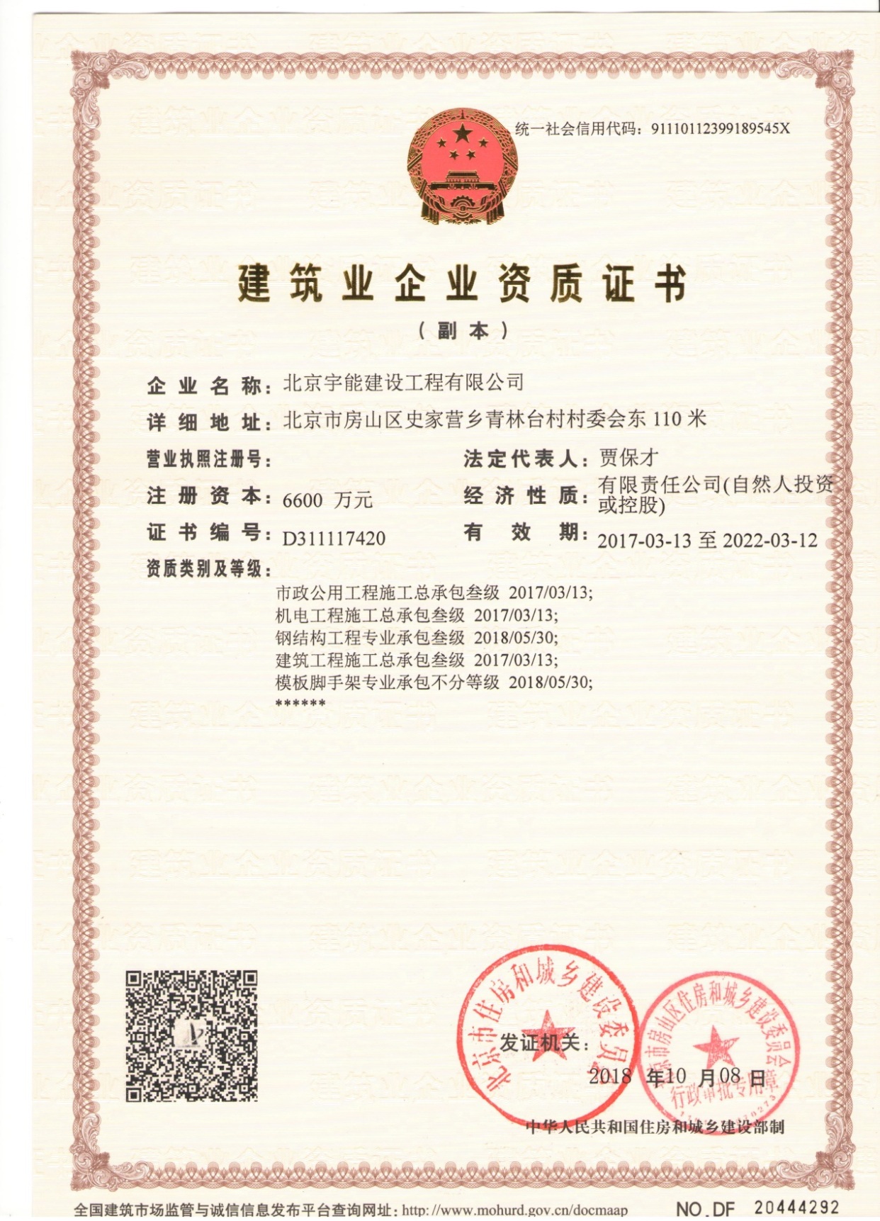 北京宇能建設工程有限公司成立于2014年5月16日,前身是北京博遠天宇電力科技有限公司,注冊資金6600萬元。具有《市政公用工程施工總承包叁級》、《機電工程施工總承包叁級》、《建筑工程施工總承包叁級》、《建筑裝修裝飾工程專業承包貳級》、《電子與智能化工程專業承包貳級》、《鋼結構工程專業承包叁級》、《防水防腐保溫工程專業承包貳級》、《建筑幕墻工程專業承包貳級》、《模板腳手架資質》等;同時榮獲AAA誠信企業證書、AAA級誠信經營示范單位、AAA重合同守信用企業證書、AAA級企業資信等級證書。鑒于公司領導的為人誠信,作風良好,經315全國征信系統誠信企業認證中心頒發誠信企業家榮譽證書及誠信經理人的榮譽稱號。